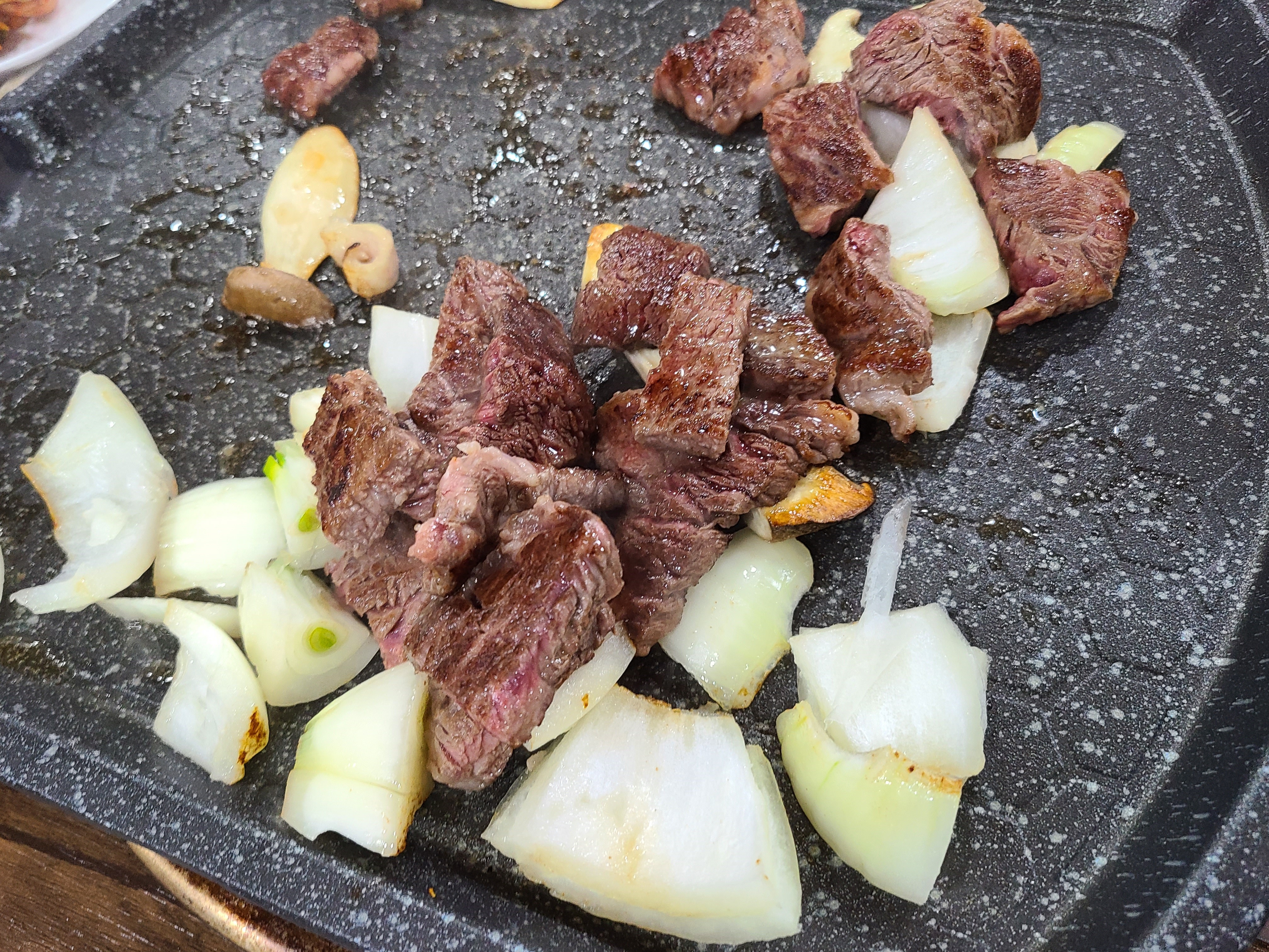 양파를 같이 구워서 소는 많이 익지 않도록 바로바로 양파 위로 피신시켜주었습니다.