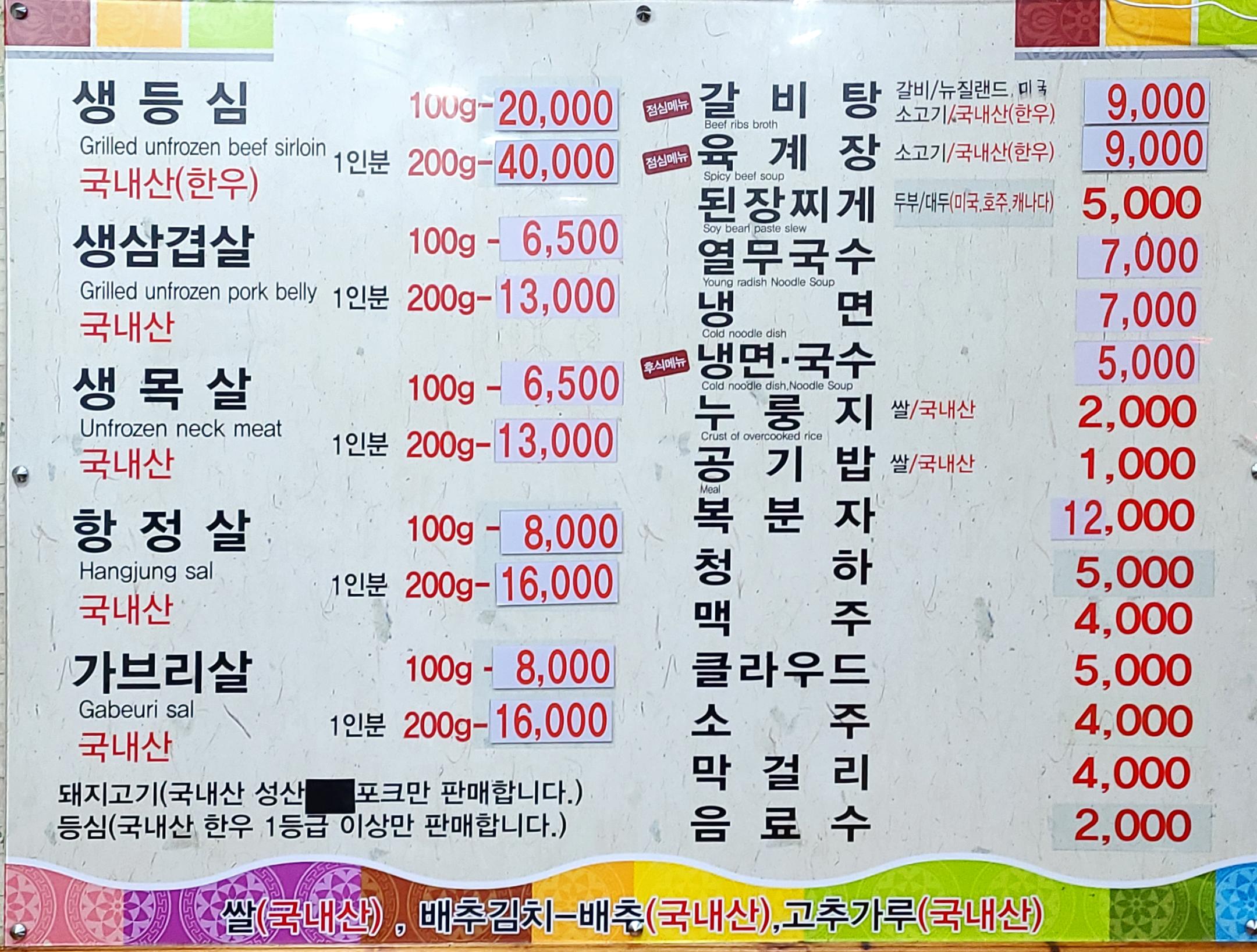 • 메뉴: 생등심, 생삼겹살, 생목살, 항정살, 가브리살, 된장찌개 각종 식사 등