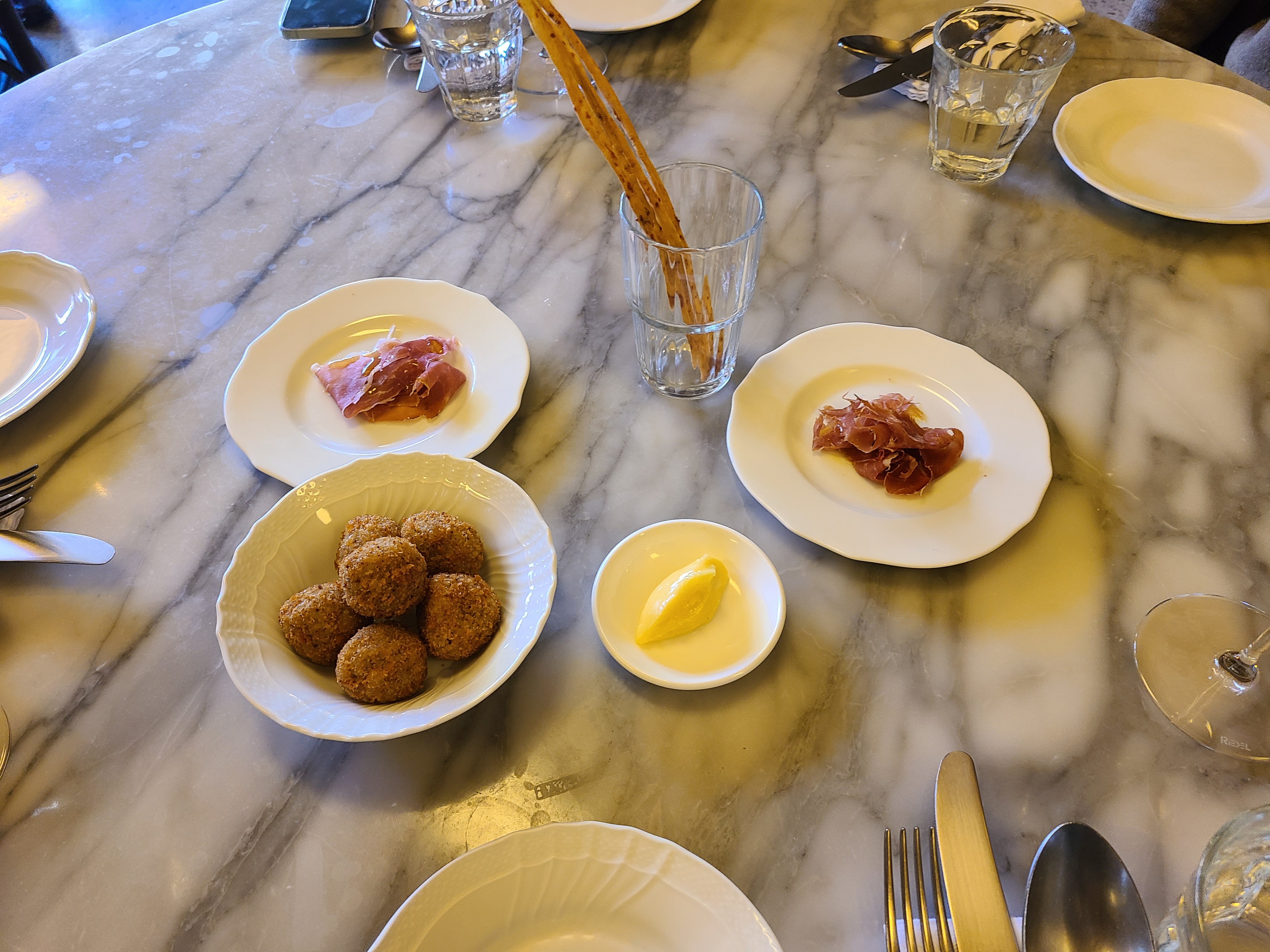 주문을 하자 식전 음식 그리시니와 프로슈토와 함께 트러플 아란치니가 나왔습니다.
