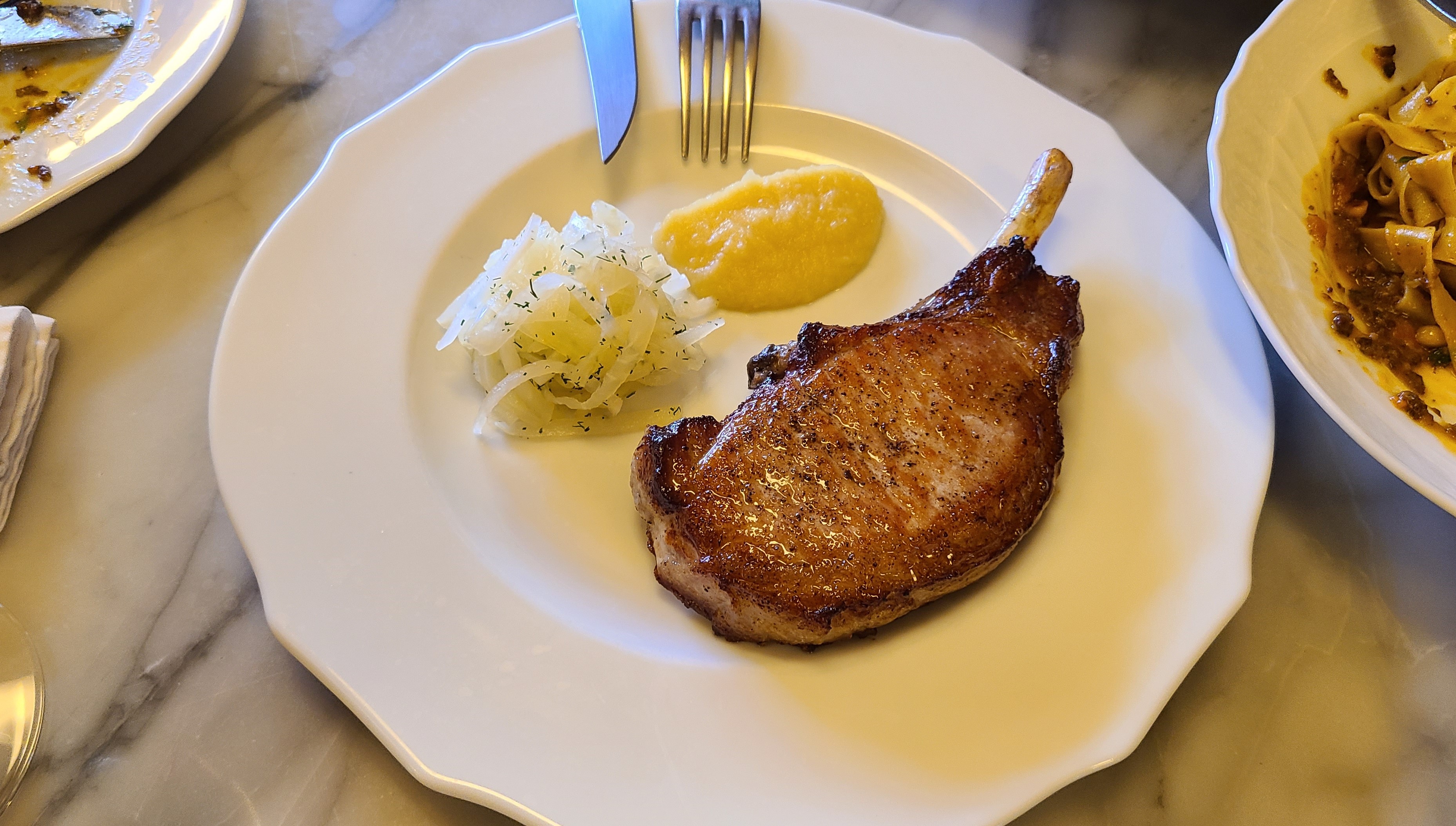 파스타를 먹고 있으니 포크 챱이 나왔습니다.