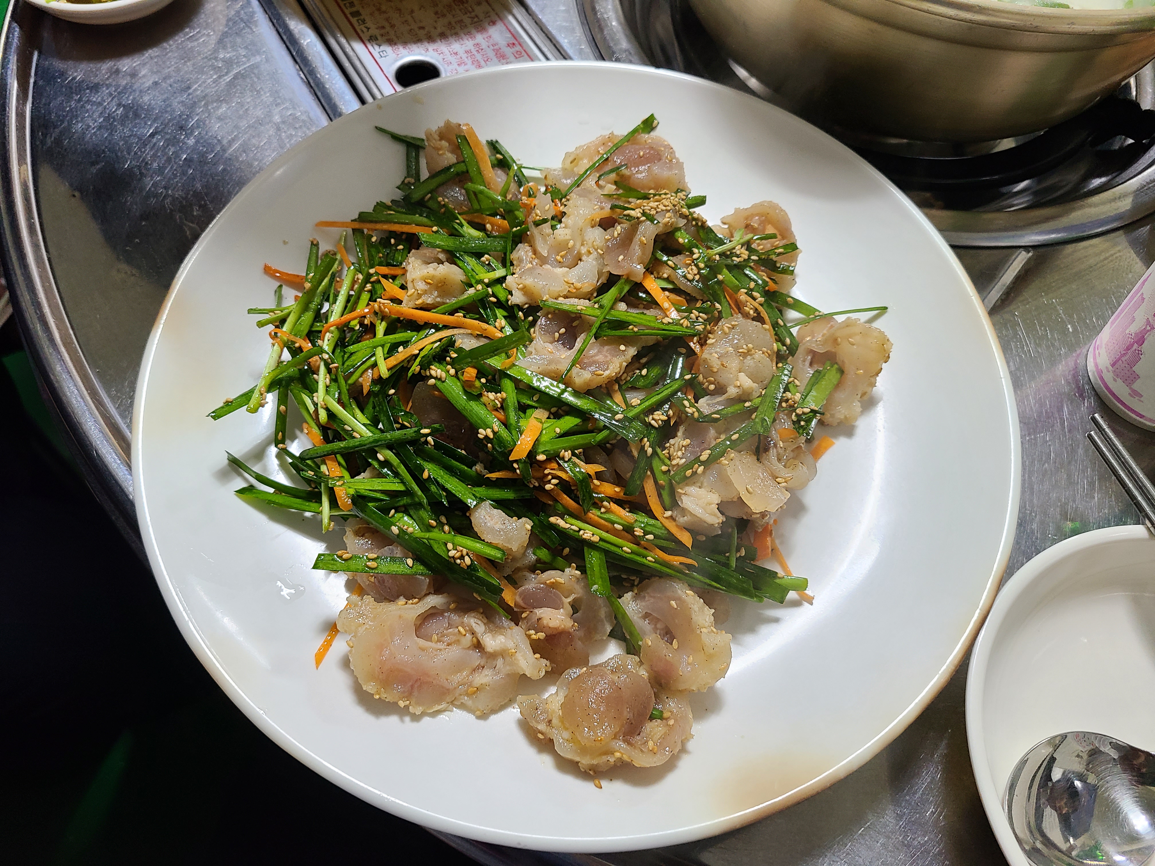 부추를 참기름 베이스로 무쳐서 스지에 간장 고추를 찍어서 부추와 함께 먹으면 정말 맛있습니다.