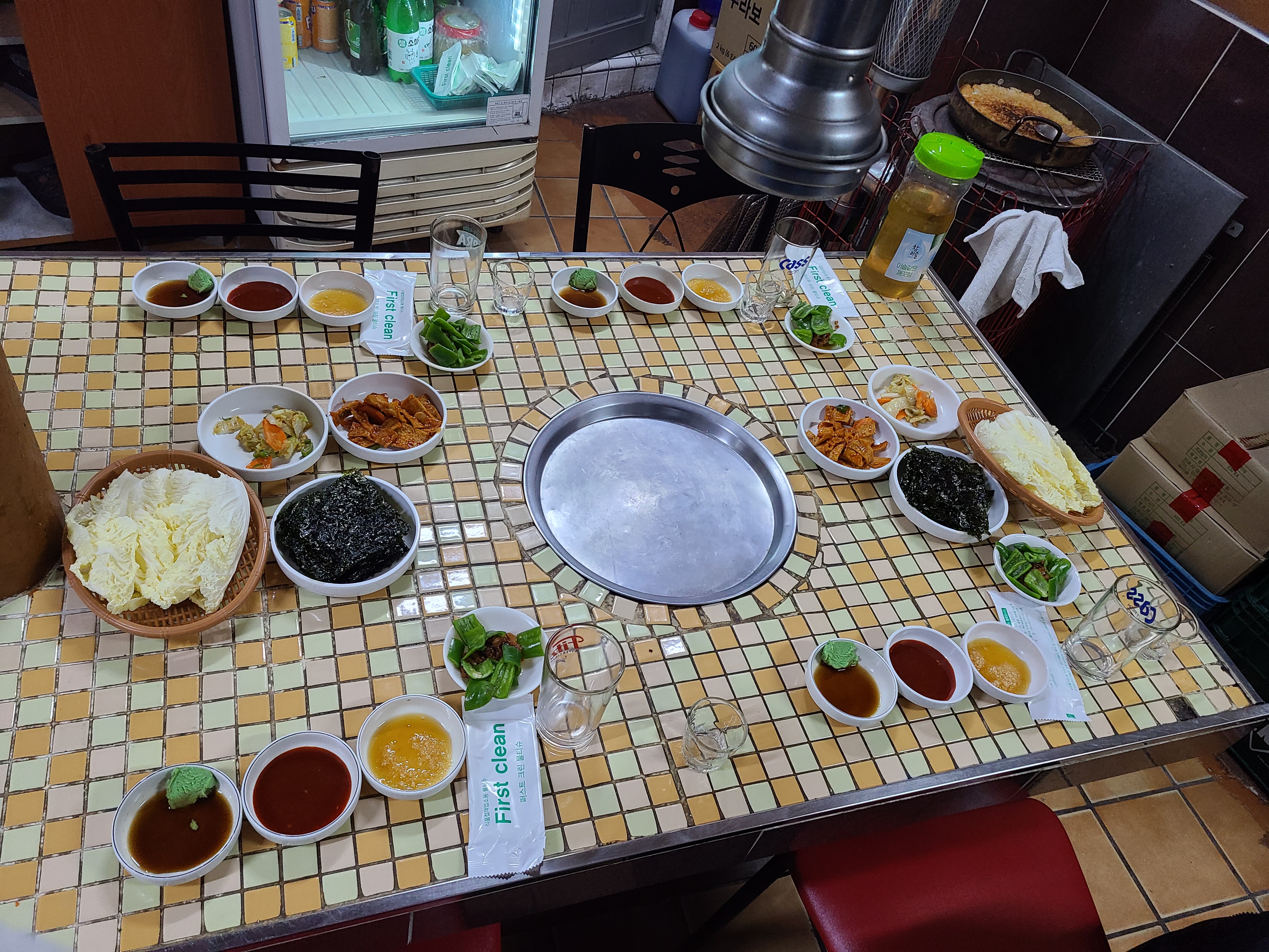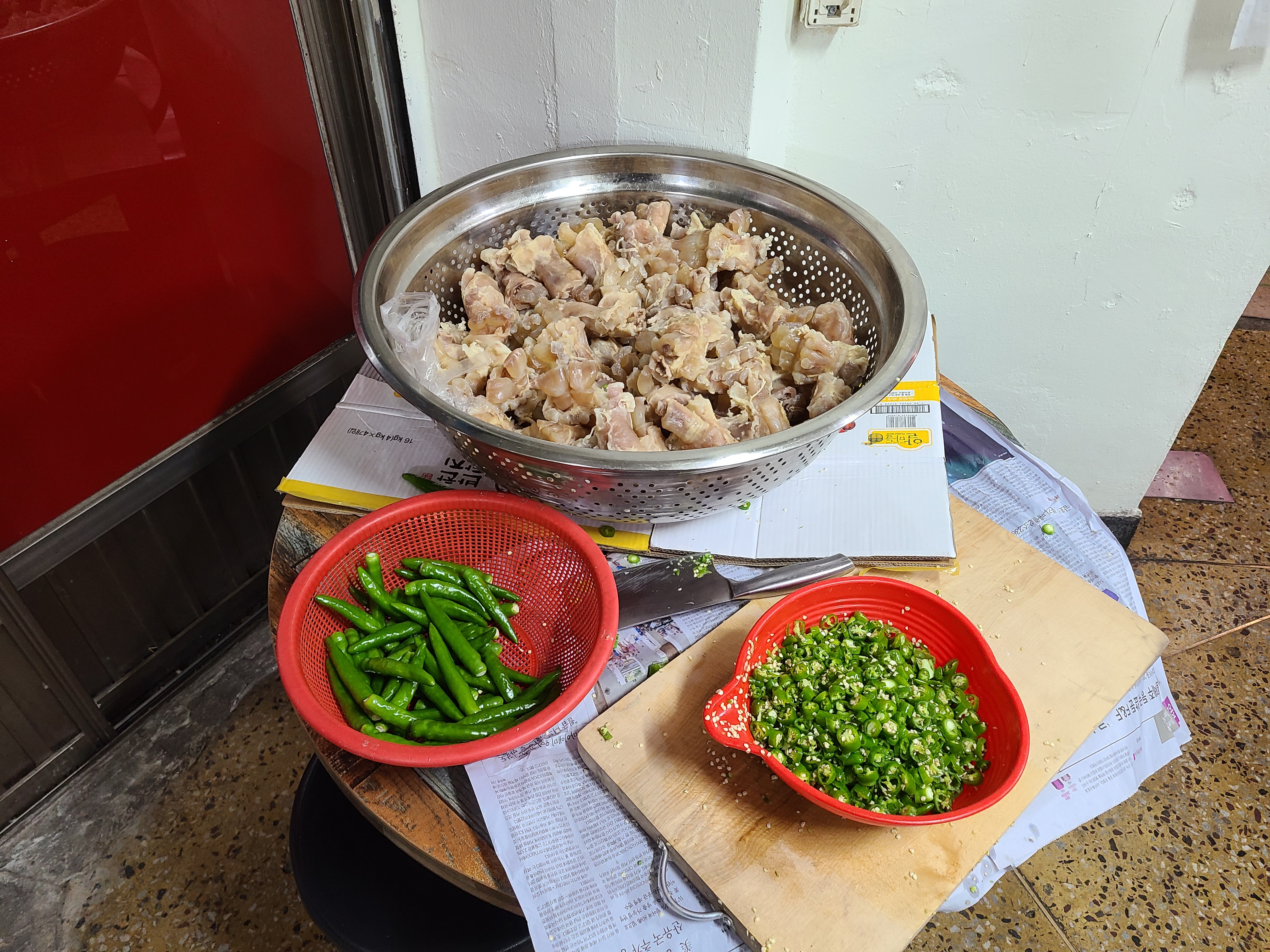 들어가면 우측에는 스지와 수시로 고추를 다지고 있는 테이블이 있습니다.