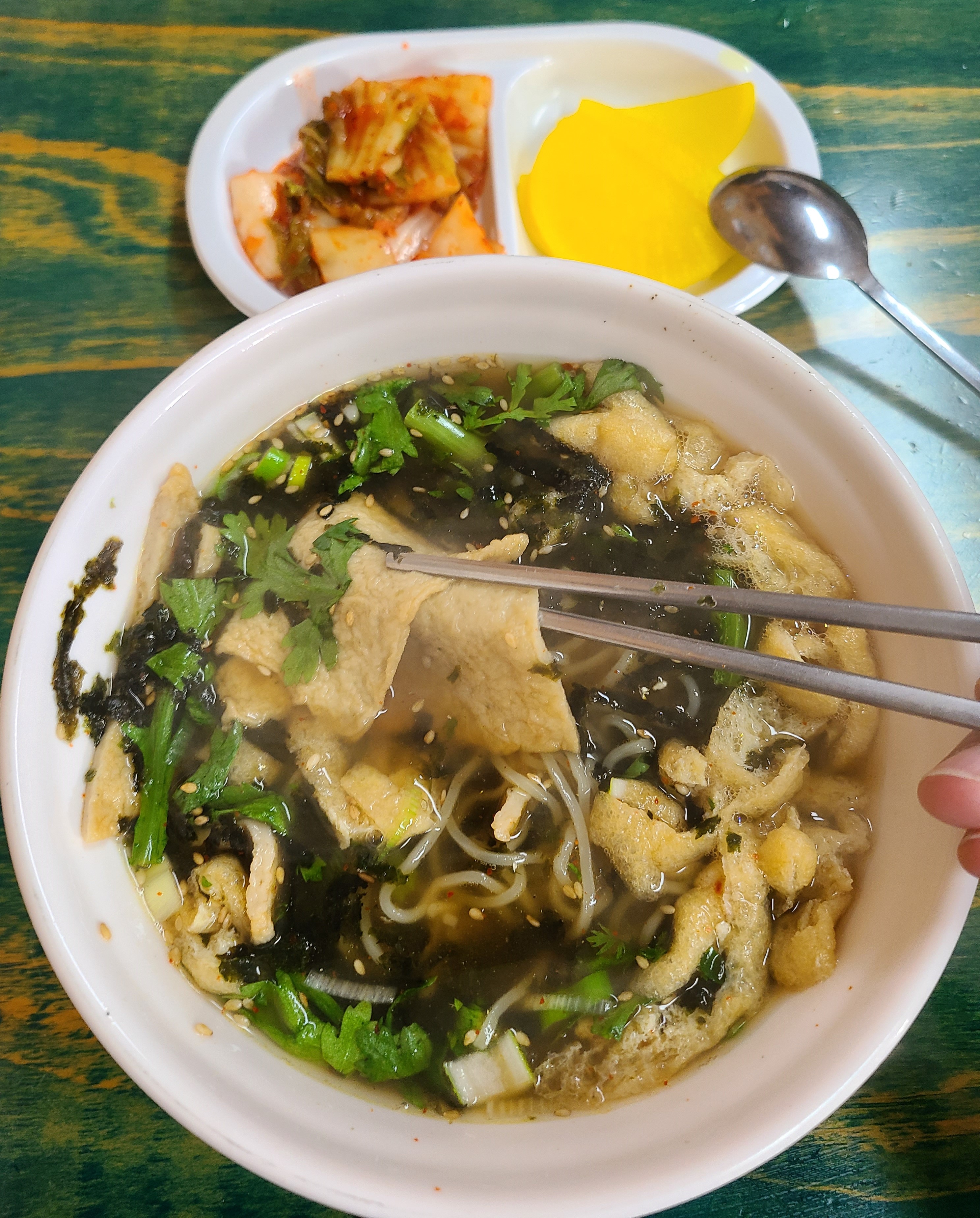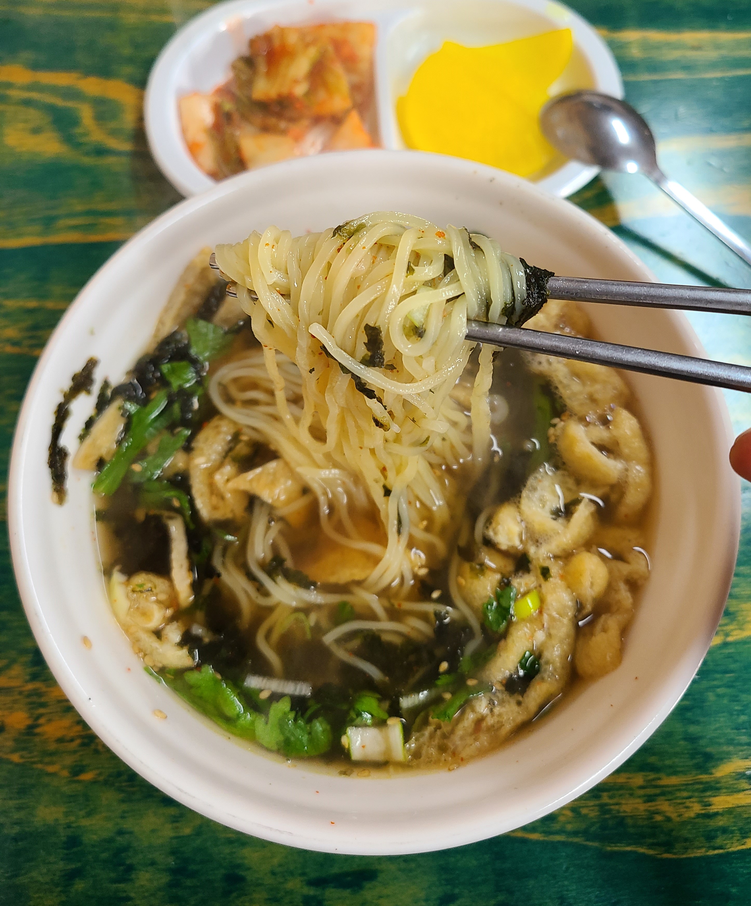 어묵과 유부, 쑥갓, 김, 파 등이 들어가 있습니다.