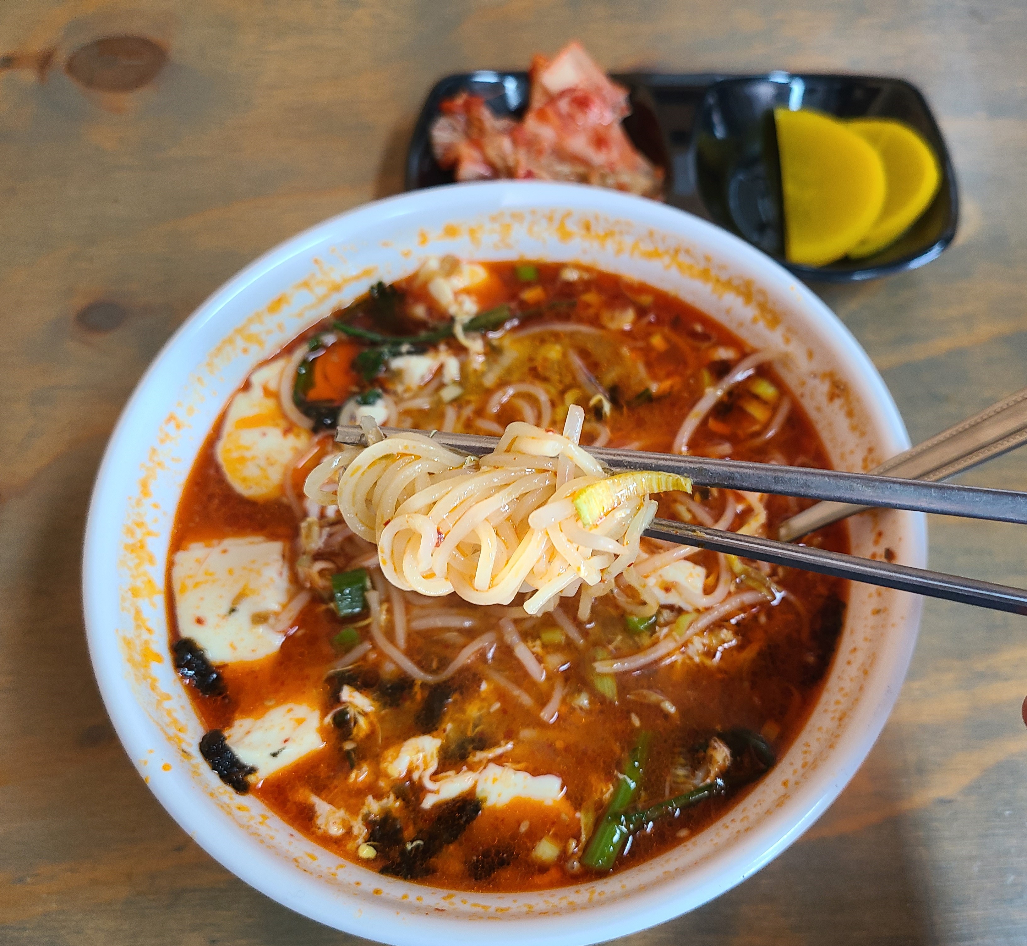 고추기름이 듬뿍 들어가서 얼큰한 국물 맛이 일품입니다.