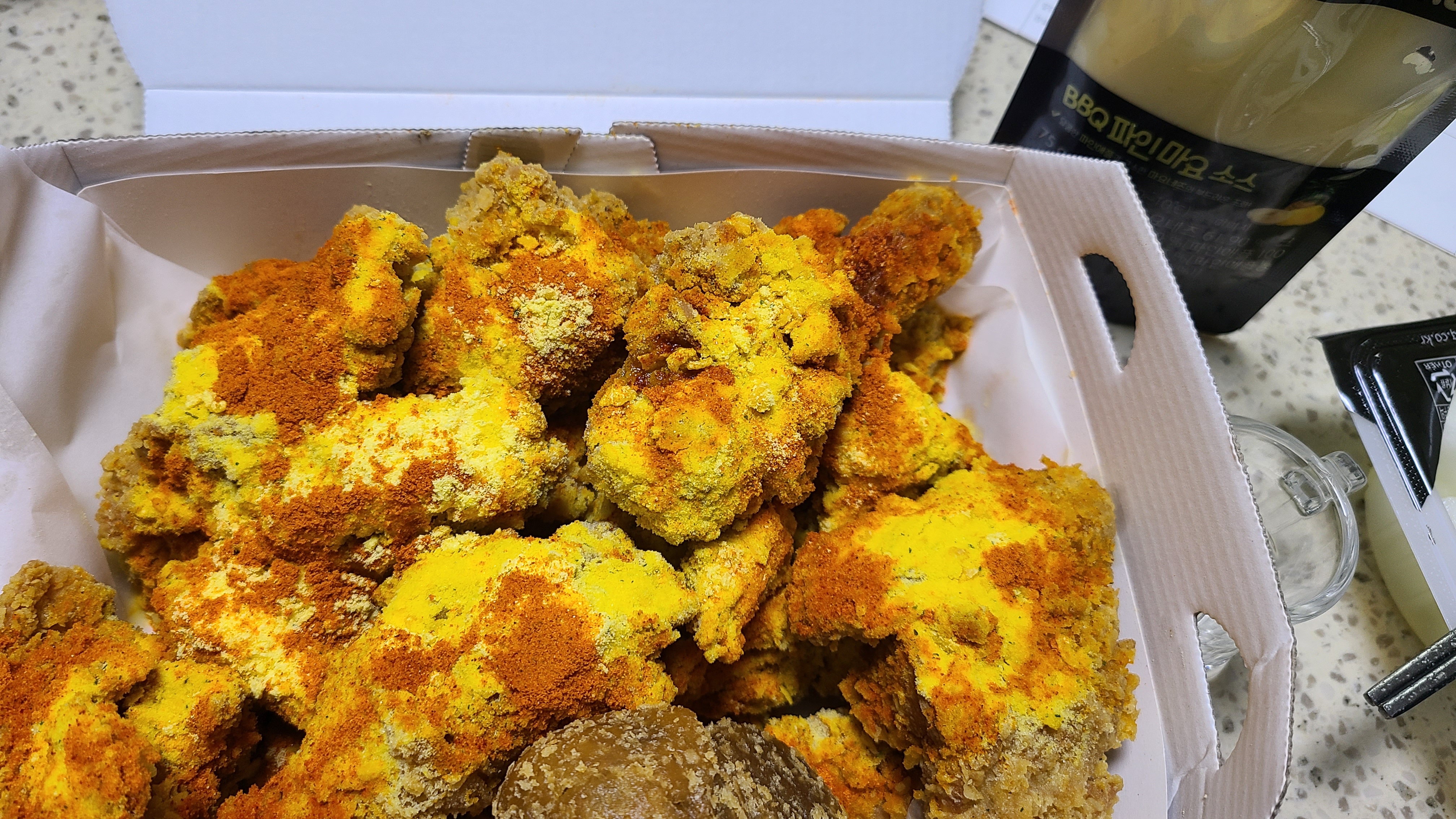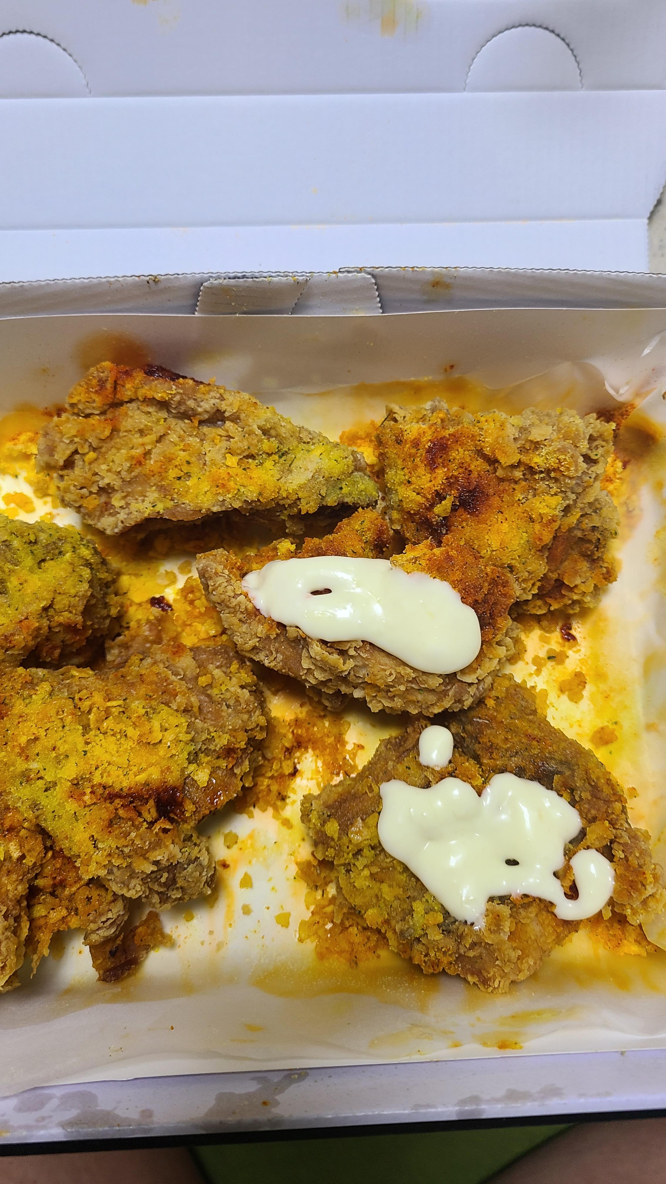 위에 시즈닝이 많이 뿌려져 있던 곳보다는 아래쪽의 치킨에는 시즈닝이 적게 묻어 있어 먹을만했습니다.