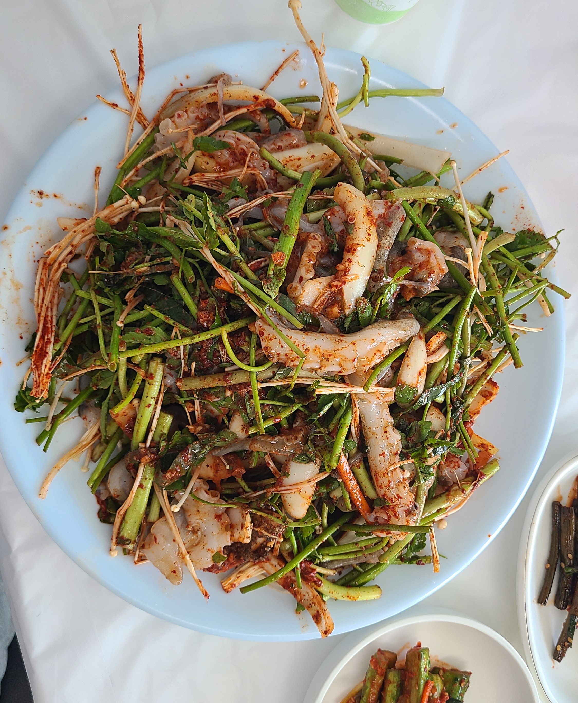 드디어 나왔습니다. 쭈꾸미는 다리와 몸통이 다 분리돼서 나오소 미나리와 양파, 팽이버섯 등에 잘 버무려 저 있습니다.생물이 100%는 아닌 것 같은 느낌이었습니다.샤브샤브는 살아있는 주꾸미를 눈으로 확인하고 먹을 수 있는데 철판볶음은 이미 잘게 잘게 분해돼서 나옵니다.