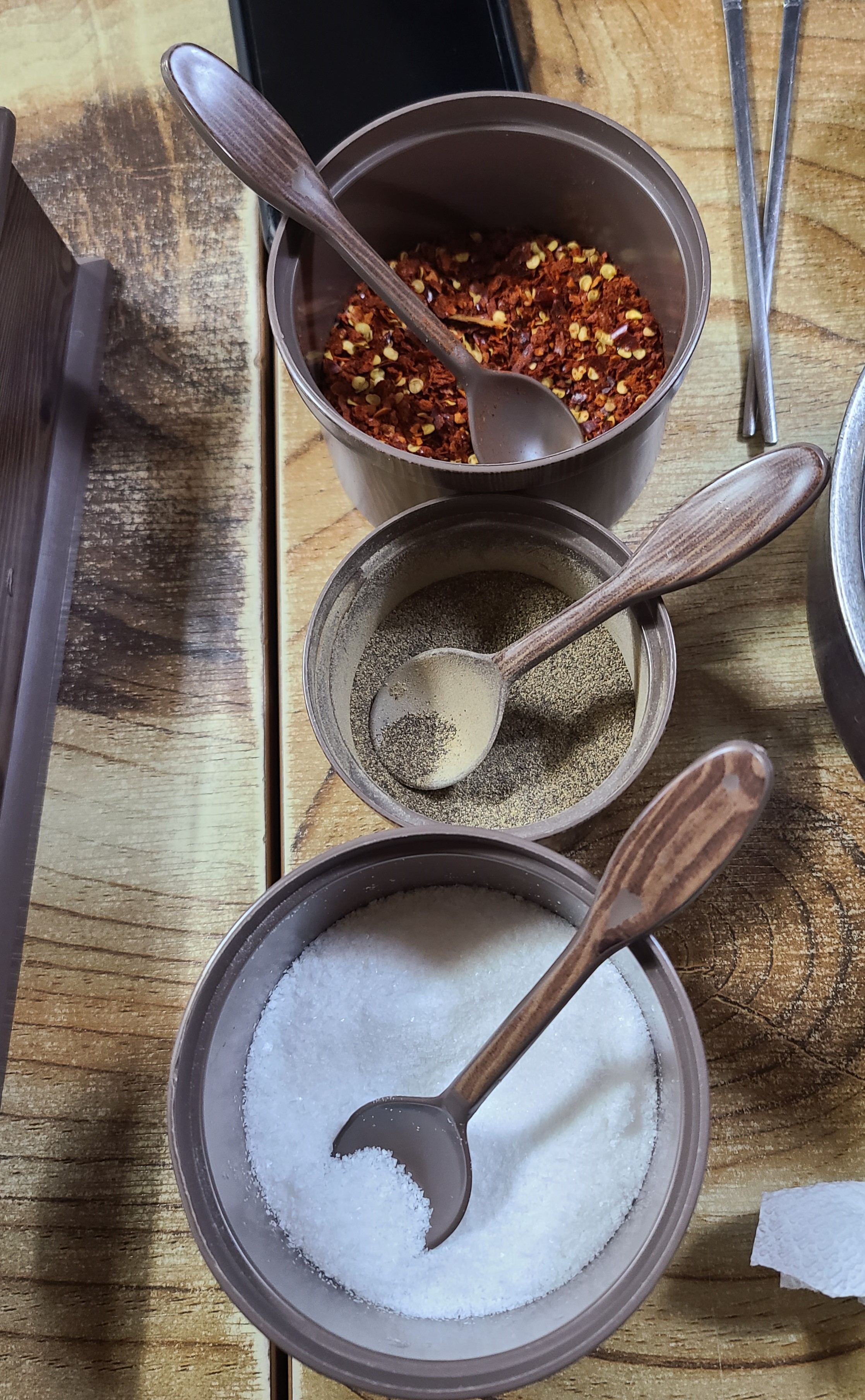 식탁에는 수저통과 굵은 고춧가루, 후추, 소금이 있습니다.