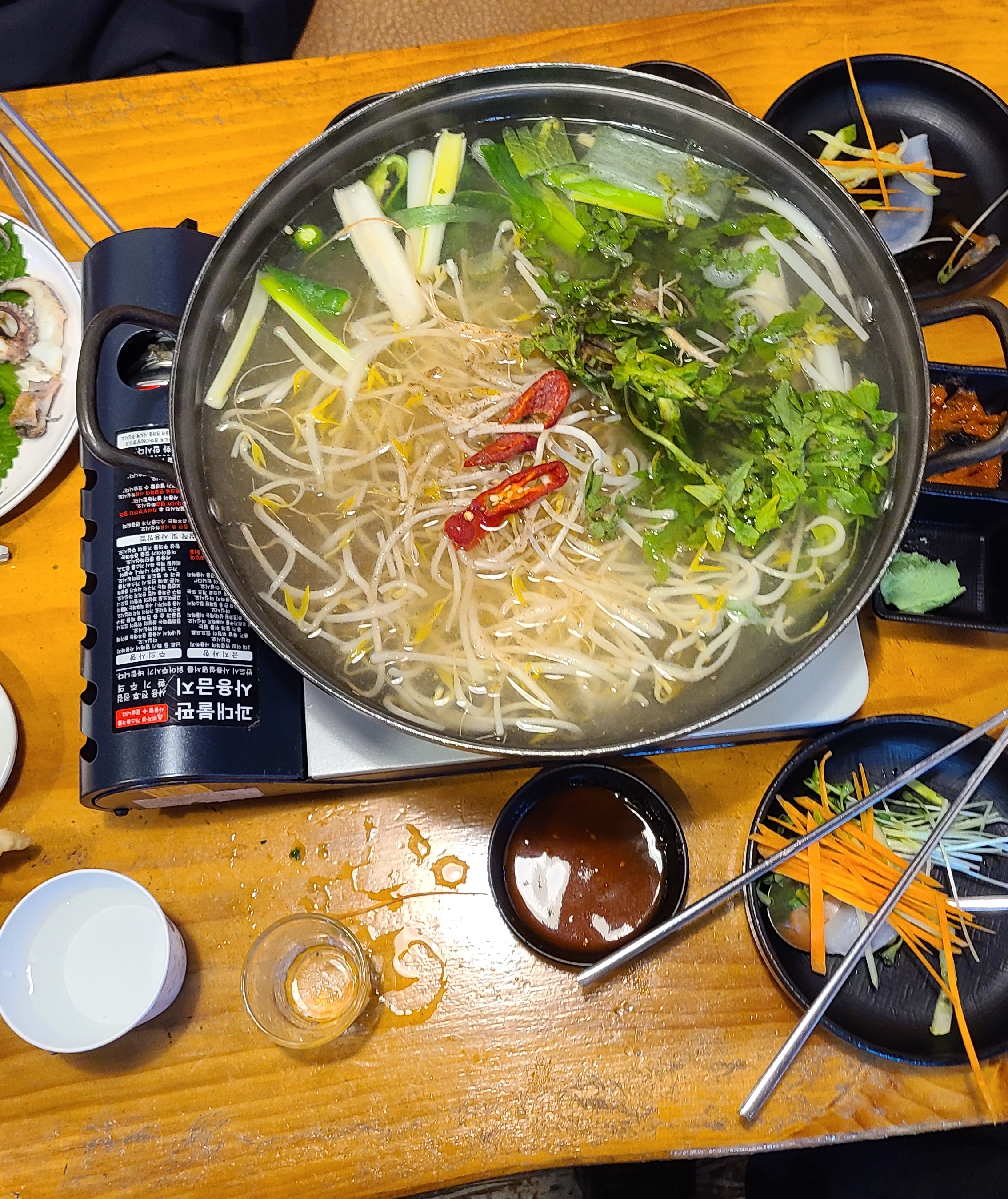 기본 냄비에 콩나물, 쑥갓, 파, 고추, 양파가 들어가 있고