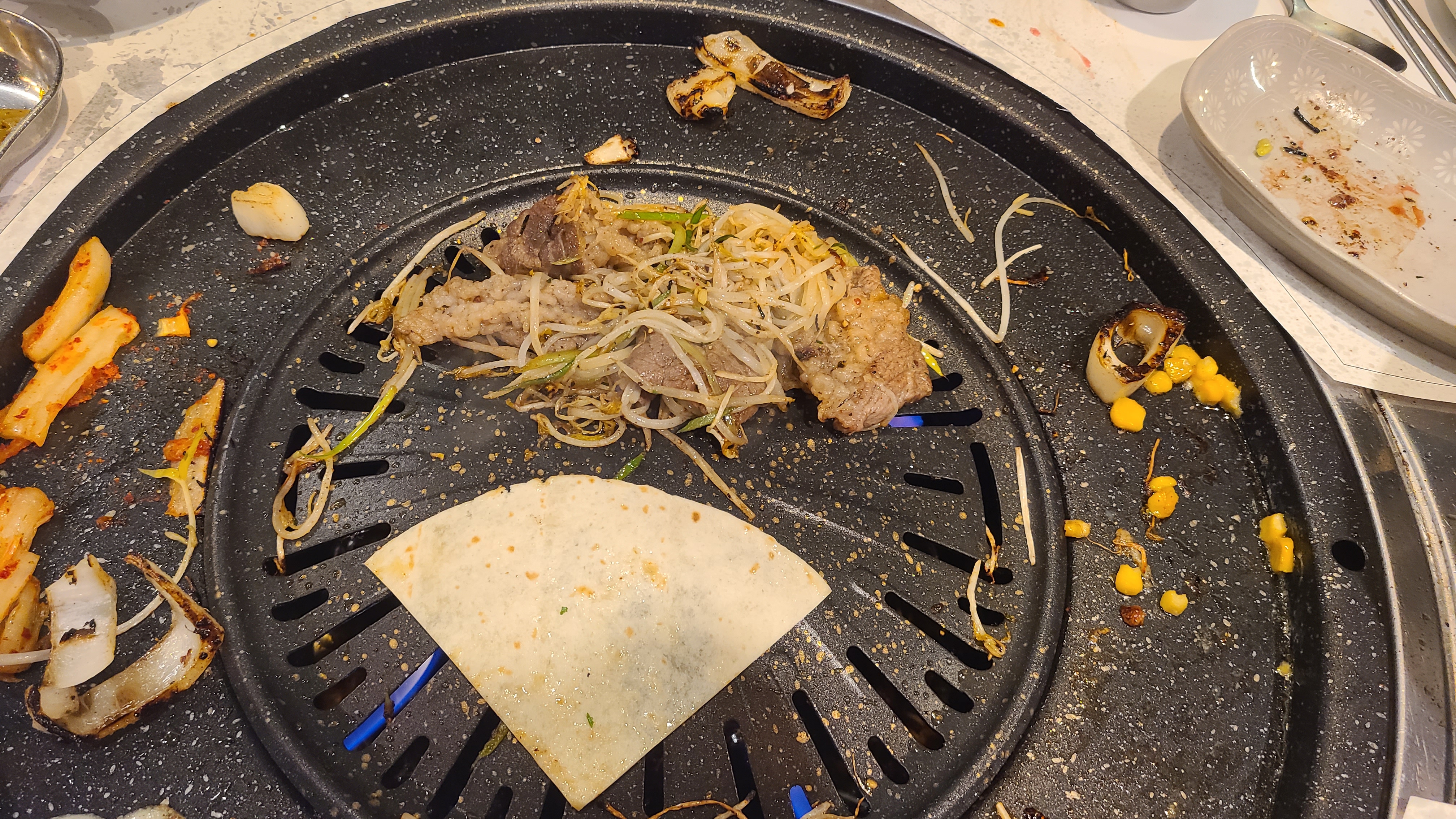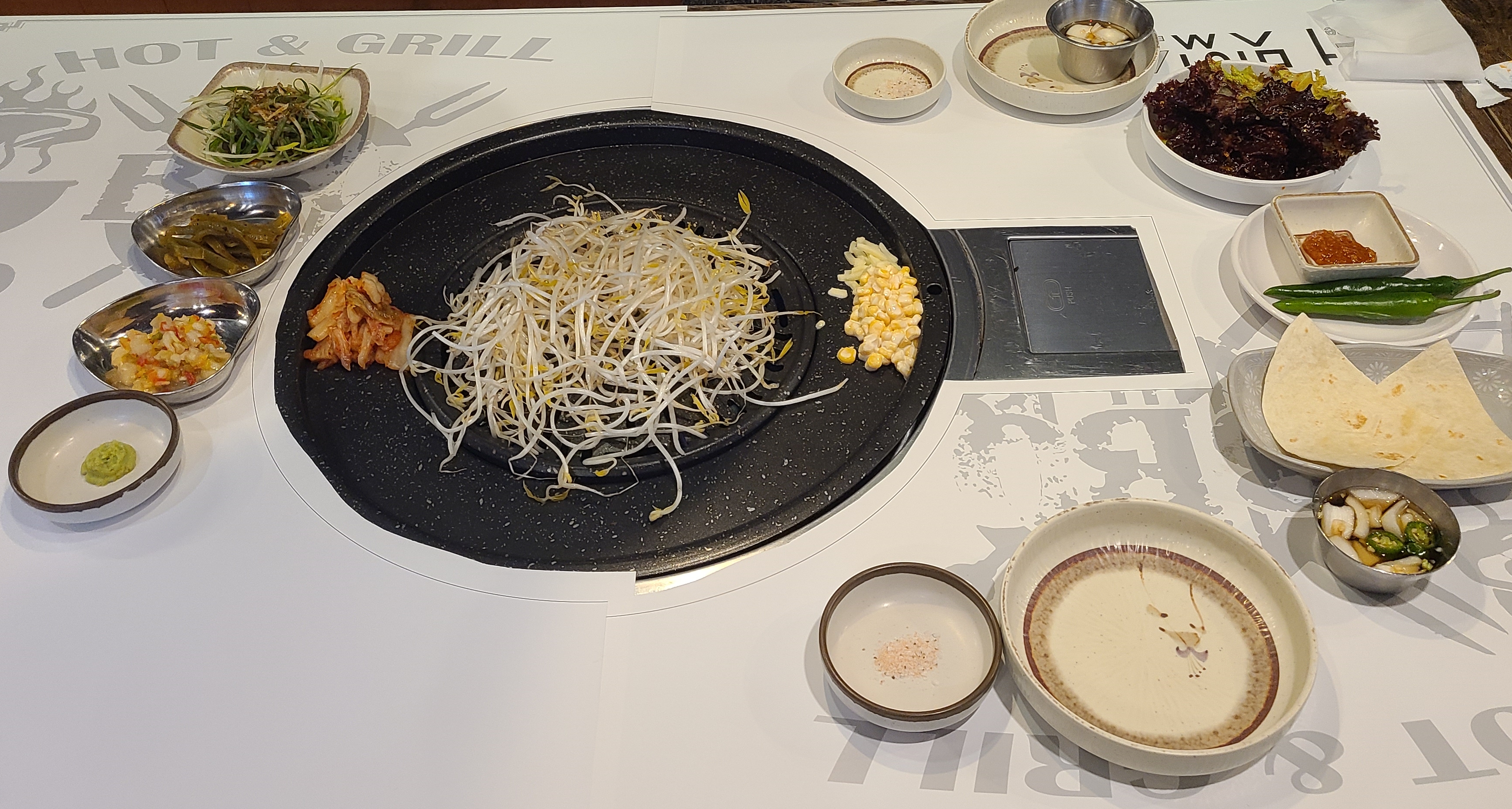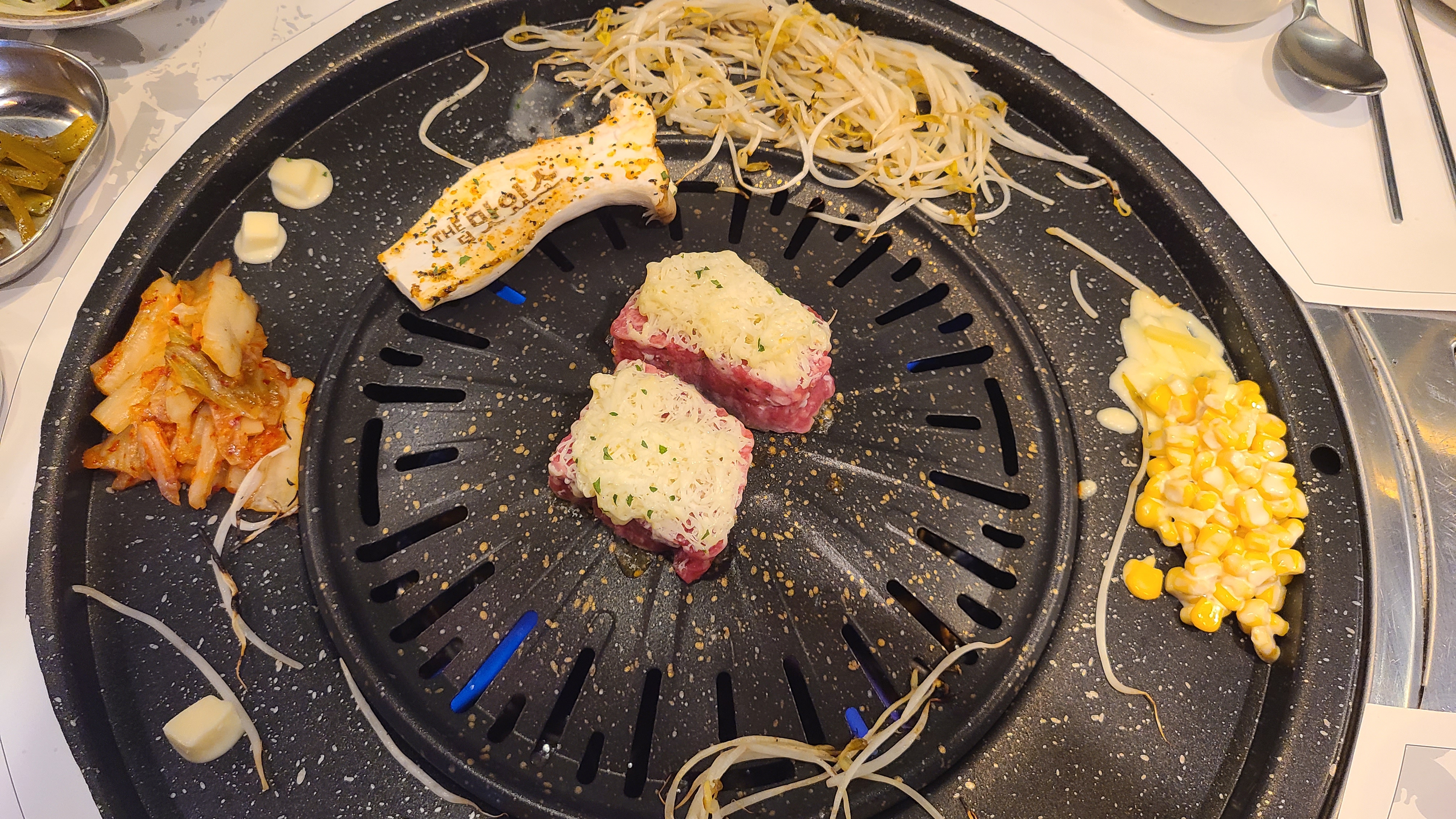 자리에 앉으면 바로 밑반찬과 불판에 숙주와 콘샐러드, 김치를 올려주십니다.